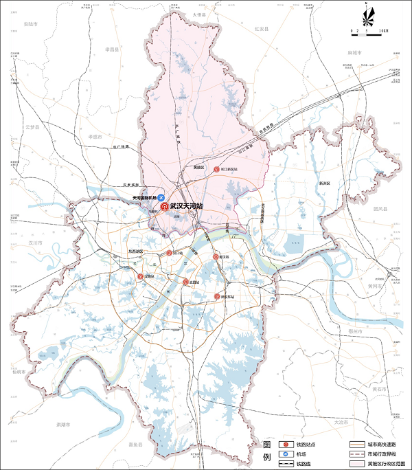 The scope of design extends eastwards to Wuhan Ring Expressway and Houhu, southwards to Fourth Ring Road, westwards to Airport Expressway and the eastern boundary of Wuhan Tianhe International Airport, and northwards to Linkong South Road, covering an area of about 7.4 km2.