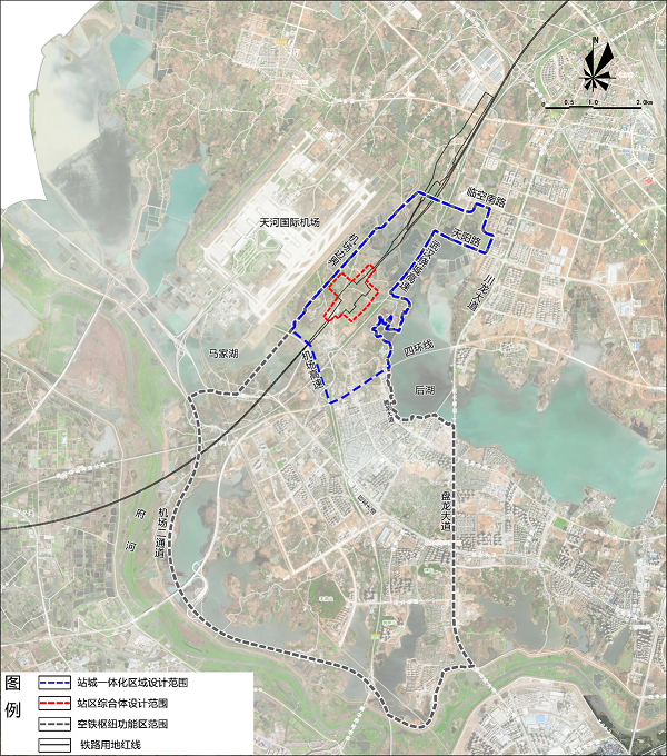 The study aims at the function area of Wuhan Tianhe Air-Rail Hub, which reaches the Panlong Avenue in the east, the Airport Second Expressway in the south, the eastern boundary of Wuhan Tianhe International Airport in the west, and Linkong South Road in the north, covering an area of about 44 km2. The scope of study can be appropriately enlarged according to the planning.